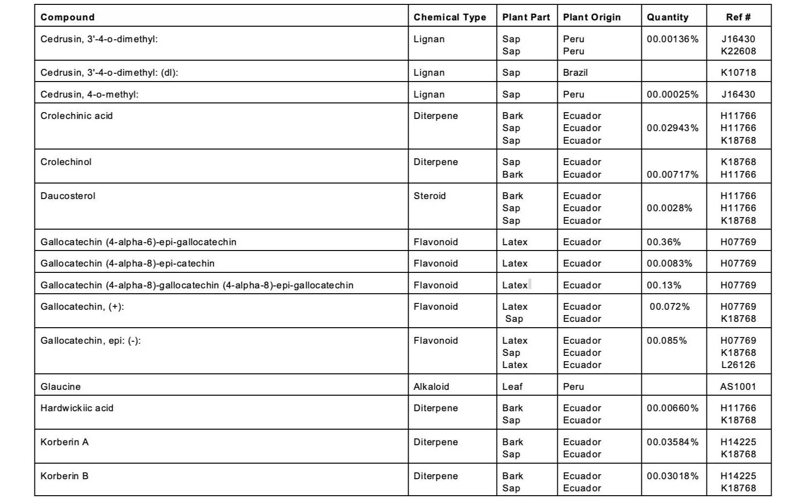 The main plant chemicals in sangre de grado include: alpha-calacorene, alpha-copaene, alpha-pinene, alpha-thujene, beta-caryophyllene, beta-elemene, beta-pinene, betaine, bincatriol, borneol, calamenene, camphene, catechins, cedrucine, crolechinic acid, cuparophenol, D-limonene, daucosterol, dihydrobenzofuran, dimethylcedrusine, dipentene, eugenol, euparophenol, gallocatechin, gamma-terpinene, gamma-terpineol, hardwickiic acid, isoboldine, korberin A & B, lignin, linalool, magnoflorine, methylthymol, myrcene, norisoboldine, p-cymene, proanthocyanidins, procyanidins, resin, tannin, taspine, terpinen-4-ol, and vanillin..